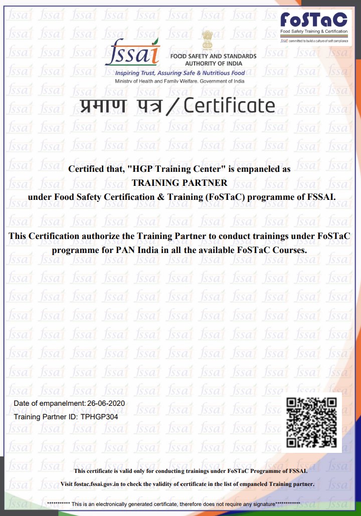 HGP Training Center is an official Training Partner of FSSAI – Food Safety & Standards Authority Of India under FoSTaC – All Courses – PAN India.